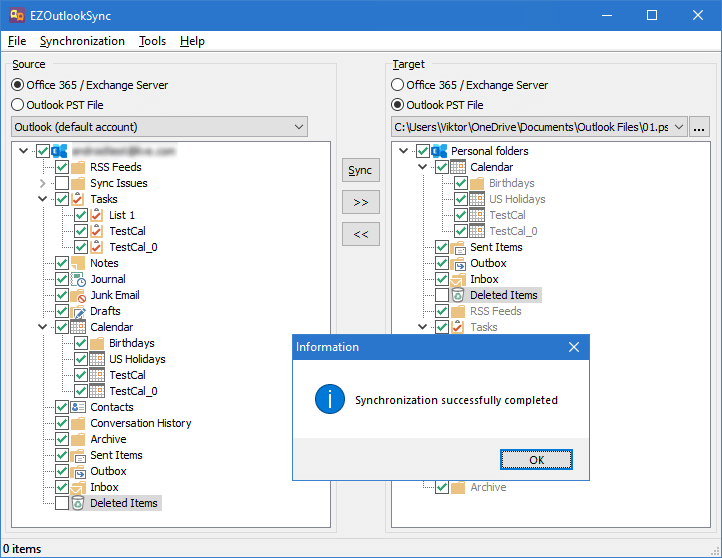 Synchronization summary window is shown before sync and lists the detailed information about which items are to be synchronized.